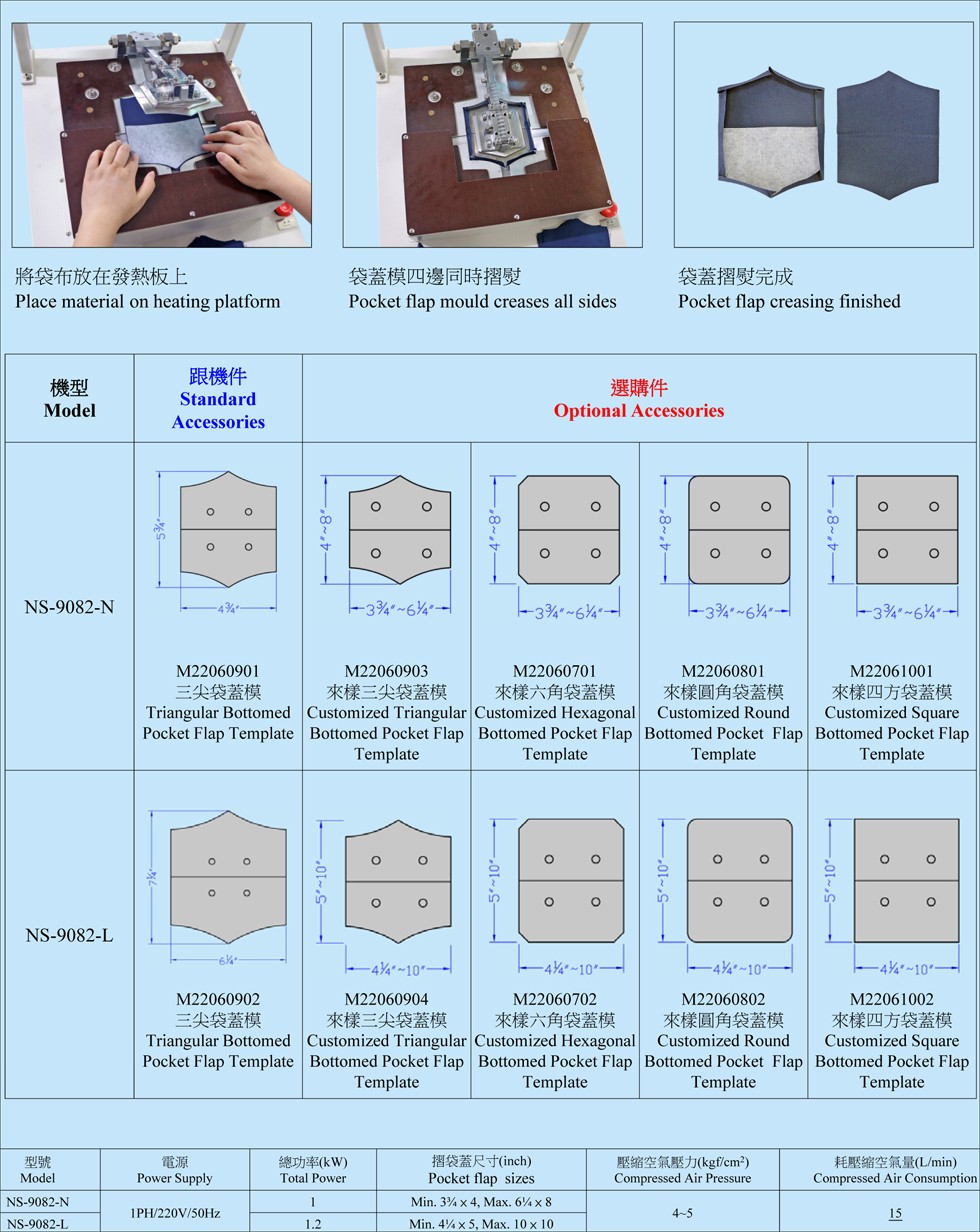 3.特別設(shè)計(jì)袋蓋模,可四邊折合及壓出中線,然后把折好的布料對(duì)折形成袋蓋